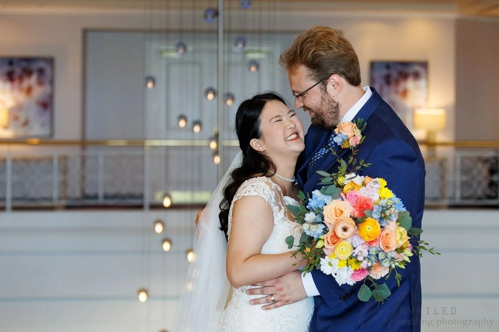 A laughing bride holding a colorful flower bouquet and a groom in a navy suit during a wedding session by Unveiled Wedding Photography.